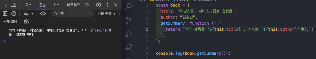 위 코드는 book 객체의 getSummary 메서드를 호출하여 책의 제목과 저자 정보를 문자열로 반환한다.