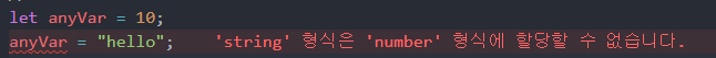 다음과 같이 변수 anyVar를 number 타입의 값 10으로 초기화 한 후, string 타입의 값 "hello"를 저장하면 오류가 발생한다.