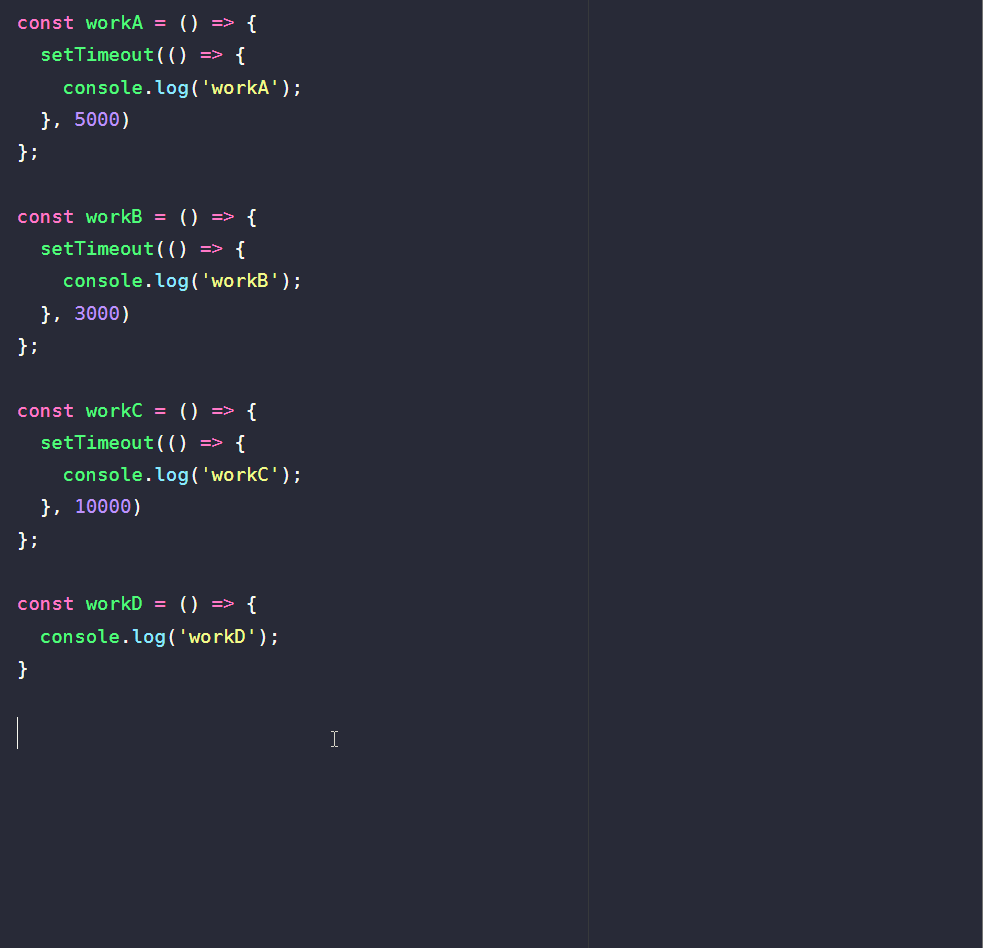 아래와 같이 workA, workB, workC 3가지 함수가 실행 후 종료되기까지 걸리는 시간이 각각 5초, 3초, 10초라고 가정해보자.
