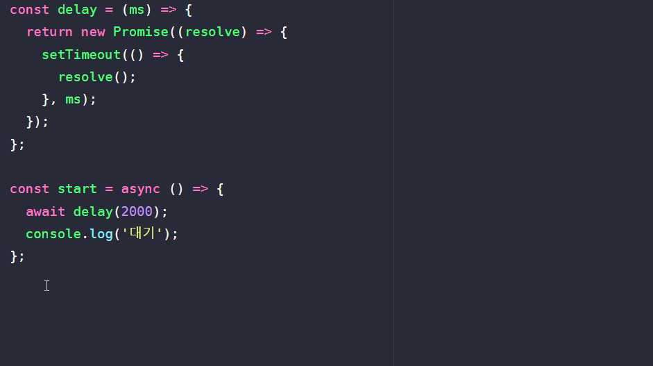 코드를 실행해보면 '대기'가 출력되는데, 이는 start함수의 반환 값과 start함수가 반환하는 프로미스 객체의 resolve값이 동일하기 때문이다.