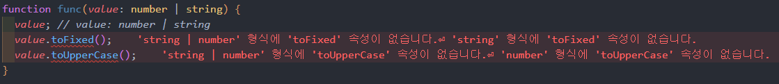 위 코드에서 value는 number 또는 string 타입일 수 있기 때문에, toFixed()(number 메서드)와 toUpperCase()(string 메서드)를 바로 사용할 수 없다.