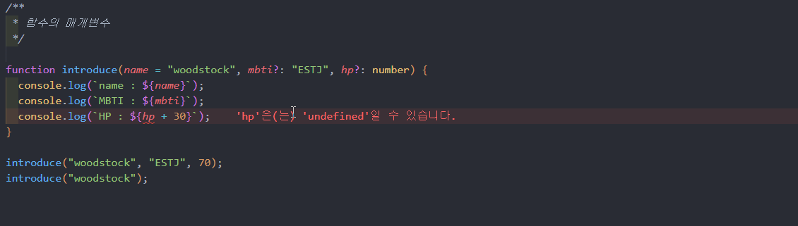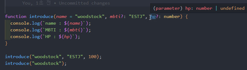 function introduce(name = "woodstock", mbti?: "ESTJ", hp?: number) {