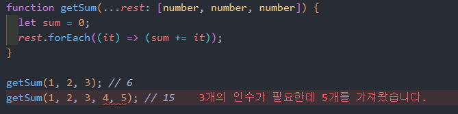 위 코드처럼 튜플 타입을 사용하면 나머지 매개변수의 개수를 정확히 3개로 제한할 수 있다.