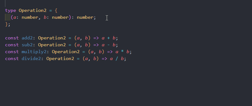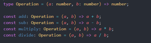Operation 타입을 정의하고, 이를 add 함수의 타입으로 지정했다. add 함수의 매개변수 타입을 Operation에서 이미 정의되었으므로 생략 가능하다.