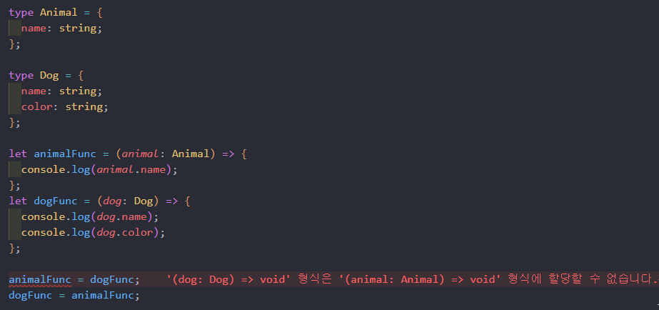 함수 내부에서는 name 프로퍼티뿐 아니라 Dog 타입에만 존재하는 color 프로퍼티에도 접근한다. 만약 animalFunc = dogFunc를 허용하면, Animal 타입의 인수가 전달되었을 때 존재하지 않는 color 프로퍼티에 접근하게 되므로 오류가 발생한다.