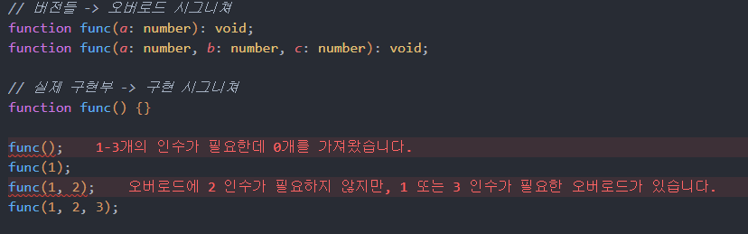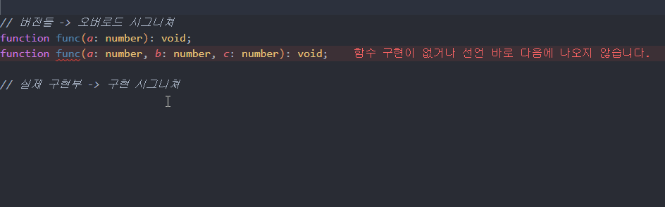 이렇게 구현부 없이 선언부만 만들어둔 함수를 오버로드 시그니처라고 한다.