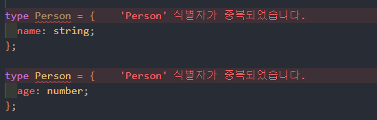 이렇게 동일한 이름의 타입 별칭을 선언하면 오류가 발생한다.