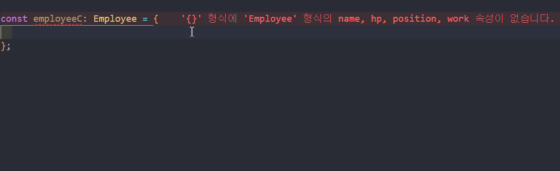 변수 employeeC를 Employee 타입으로 선언했다. 이 변수는 name, hp, position 프로퍼티와 work 메서드를 가져야 한다.