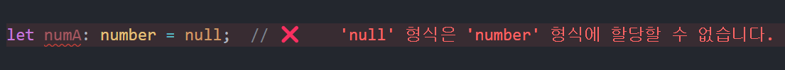 타입스크립트는 엄격한 검사를 기본값으로 하기 때문에 타입 오류가 발생하는데, 변수의 임시값으로 null을 활용하고 싶을 때에는 tsconfig.json의 strictNullChecks를 false로 설정하면 된다.